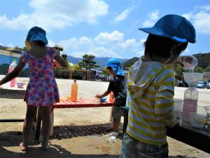 暑くなり、水遊びが始まりました。色水遊びや、シャボン玉など、水に触れて遊ぶことを楽しみます。「ねぇねぇ、こうしたらどうなるかな?」と、色水を混ぜてできる色を友達と楽しんだり、「大きいのができるかな?」とシャボン玉をつくったり、いろいろなことを試して、考える経験をして楽しみたいと思います。